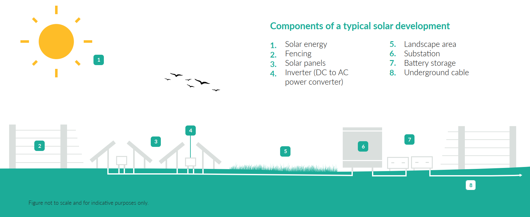We would look to begin construction soon after planning permission being granted. During the construction period, initial site setup works would take place followed by construction of the internal access route(s), ground works for cabling and grid connection and the installation of the solar panels and other associated infrastructure, including the battery storage. We expect that construction will then take up to six months.